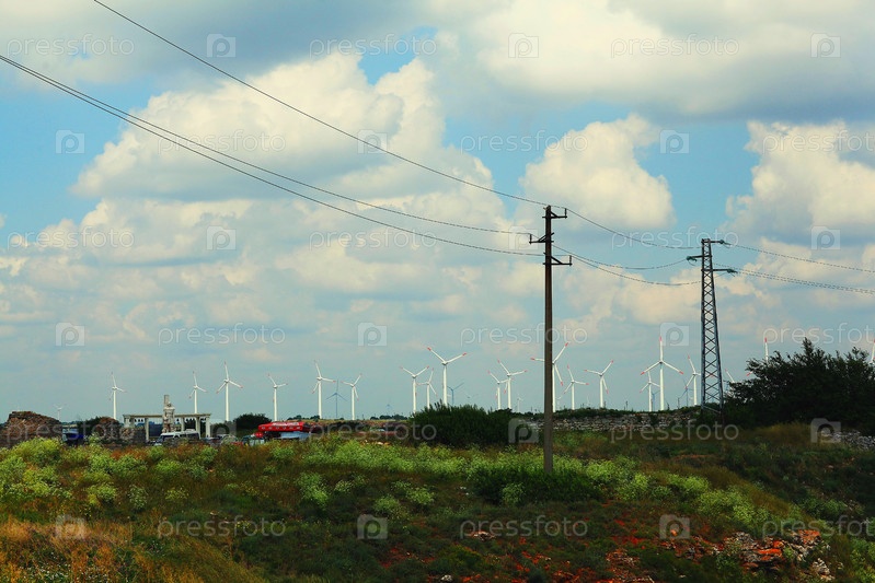 Поле пейзаж провод питания линии ветряными мельницами