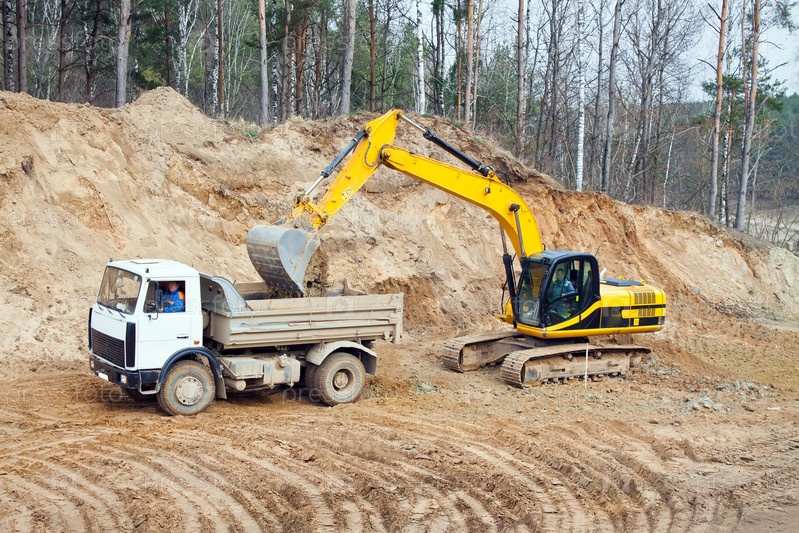 Экскаватор грузит землю в самосвал