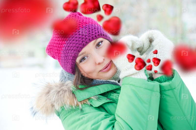 Портрет молодой девушки в зимней одежде, думающей о любви