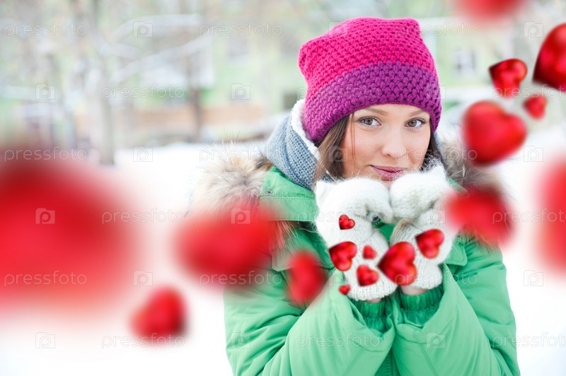 Портрет молодой девушки в зимней одежде, думающей о любви