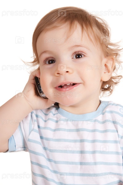 Маленький мальчик разговаривает по телефону, изолированный на белом фоне