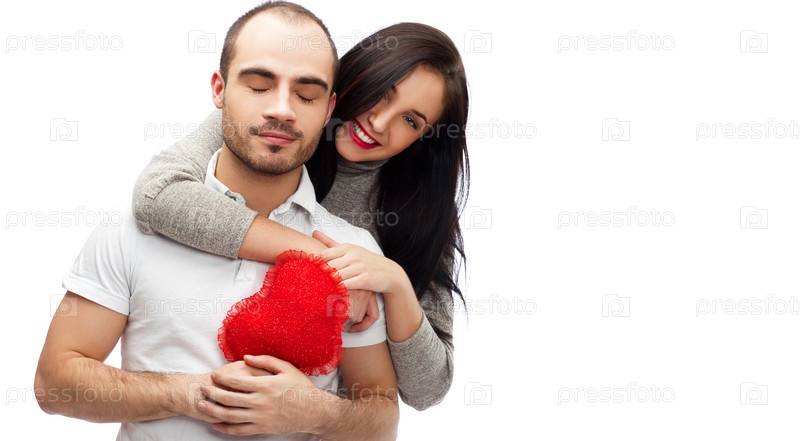 Девушка обнимает парня с красным сердцем в руках