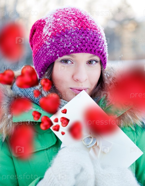 Портрет молодой девушки в зимней одежде с конвертом