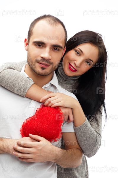 Привлекательная молодая пара с красным сердцем в руках, на белом фоне