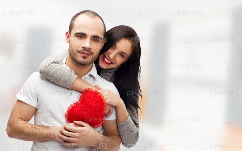 Портрет молодой пары с красным сердцем в руках на размытом фоне помещения