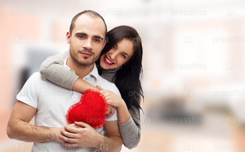 Портрет молодой пары с красным сердцем в руках на размытом фоне помещения