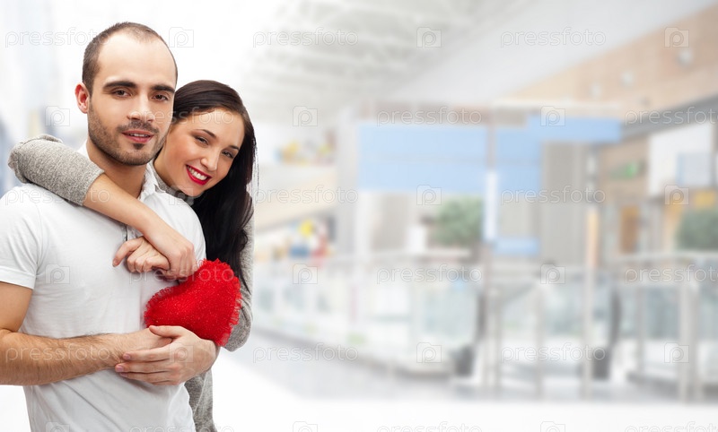 Портрет молодой пары с красным сердцем в руках на размытом фоне помещения