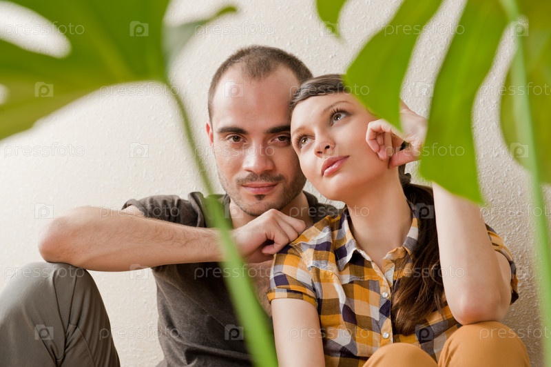 Молодая пара, сидящая у стены за комнатным цветком