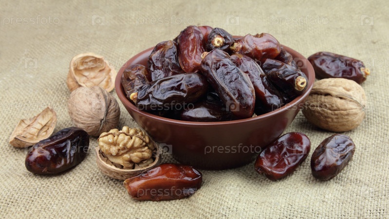 Финики и грецкие орехи в миске на льняной ткани