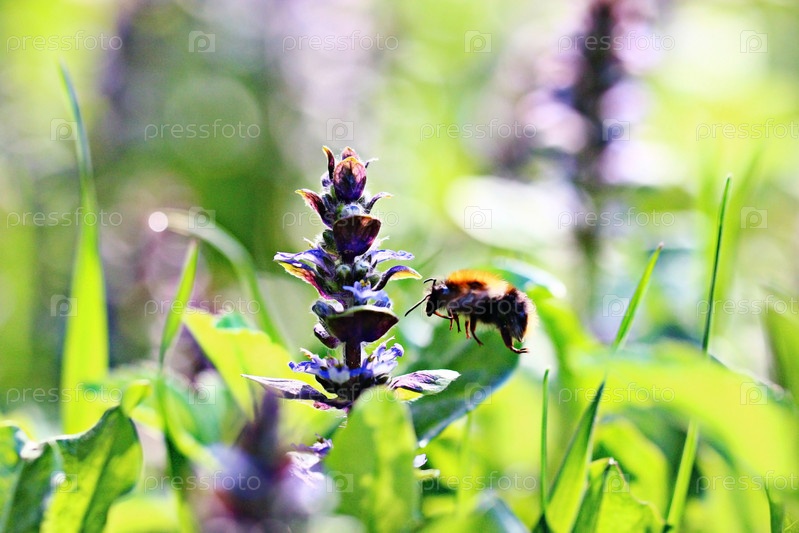 Шмель голубые цветы трава зеленый фон