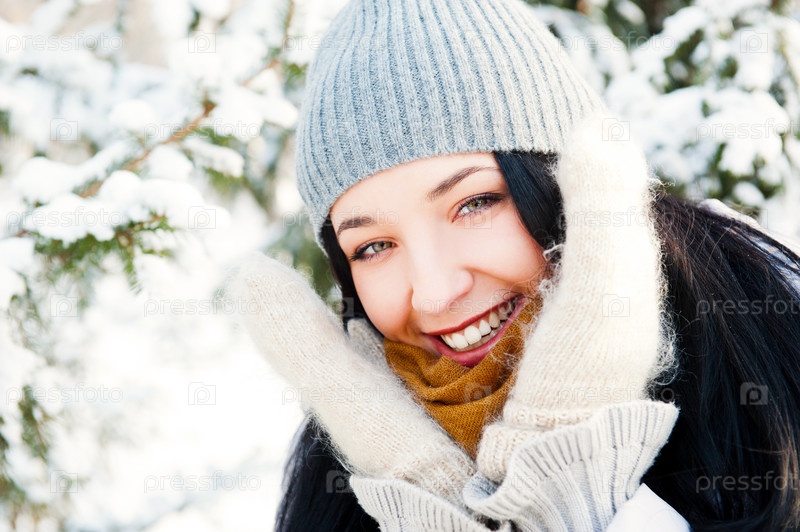 Улыбающаяся красивая девушка в теплой одежде в зимнем лесу