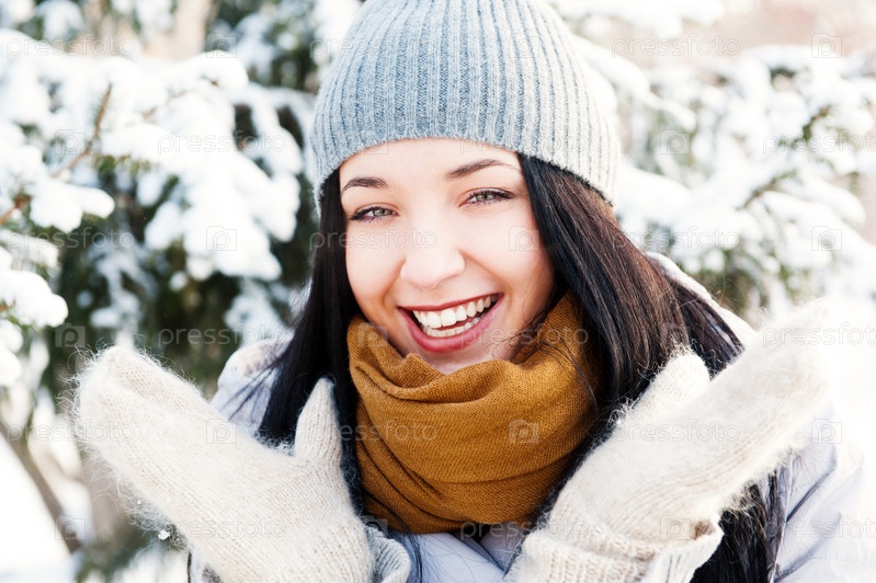 Улыбающаяся красивая девушка в теплой одежде хлопает в ладоши в зимнем лесу