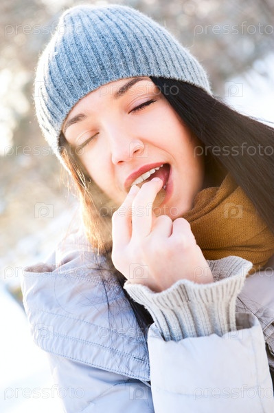Улыбающаяся красивая девушка ест вкусную шоколадную конфету, стоя в зимнем лесу