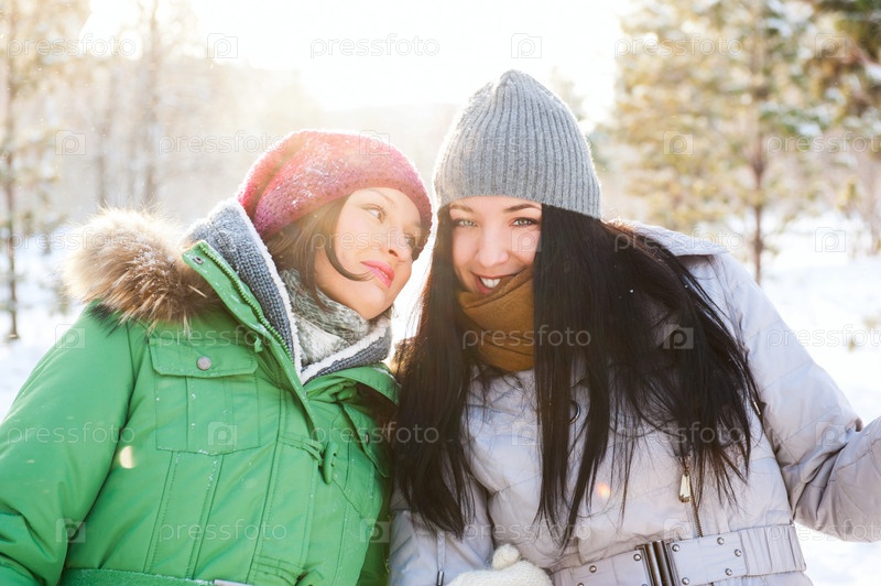 Две красивые девушки гуляют в зимнем лесу