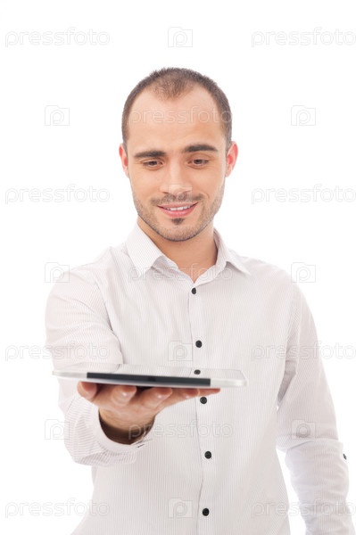 Человек с планшетным компьютером, изолированный на белом фоне