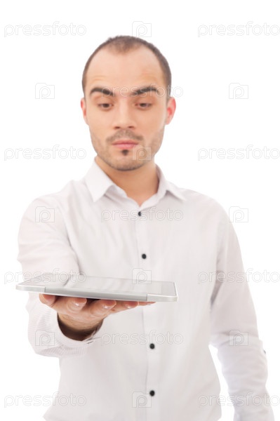 Человек с планшетным компьютером, изолированный на белом фоне
