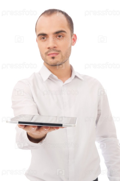 Человек с планшетным компьютером, изолированный на белом фоне