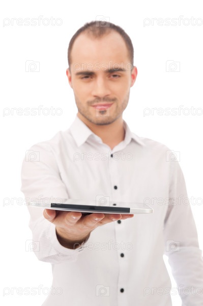 Молодой человек с планшетным компьютером, изолированный на белом фоне