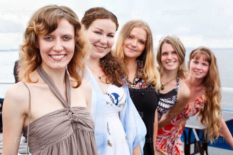Пять счастливых девушек стоят на палубе яхты