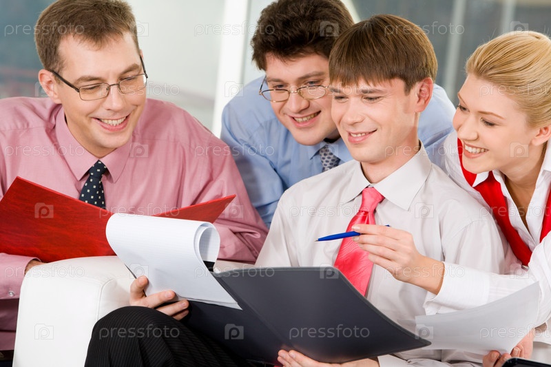 Команда из четырех бизнесменов, взаимодействующих в офисе