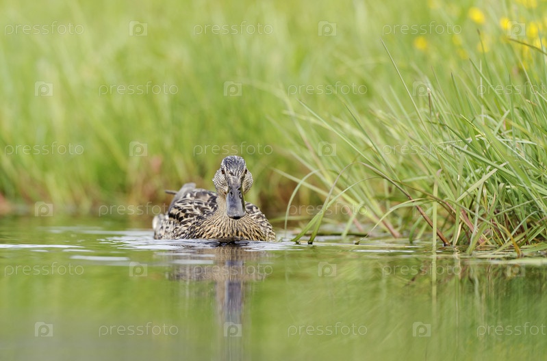 Утка, купание в пруду