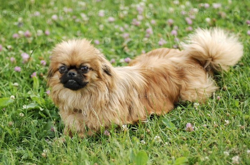 Пекинес лежит на зеленой траве