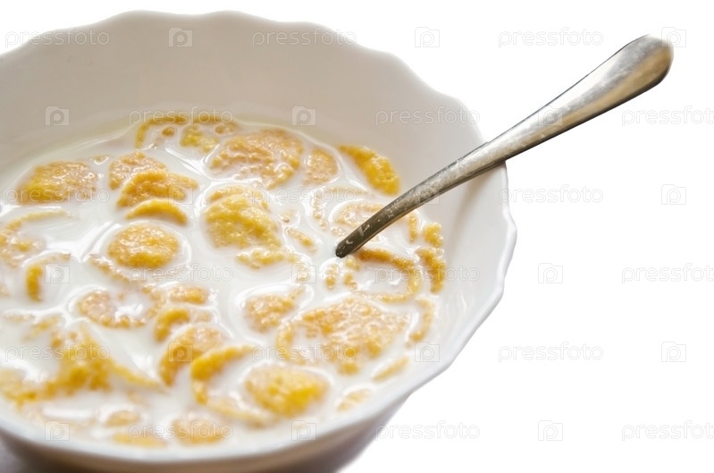 Кукурузные хлопья с молоком в тарелке, на белом фоне