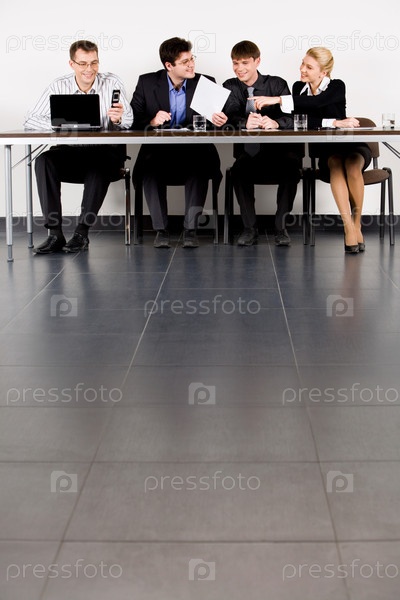 Вертикальное изображение четырех человек, сидящих за столом и работающих