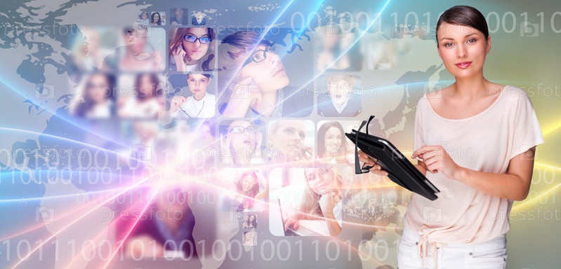 Портрет молодой женщины с планшетным компьютером на фоне карты мира, концепция международной связи