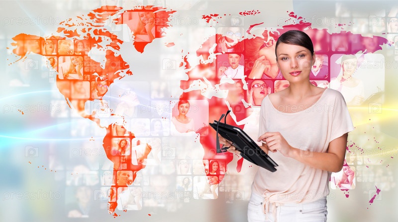 Портрет молодой женщины с планшетным компьютером на фоне карты мира, концепция международной связи