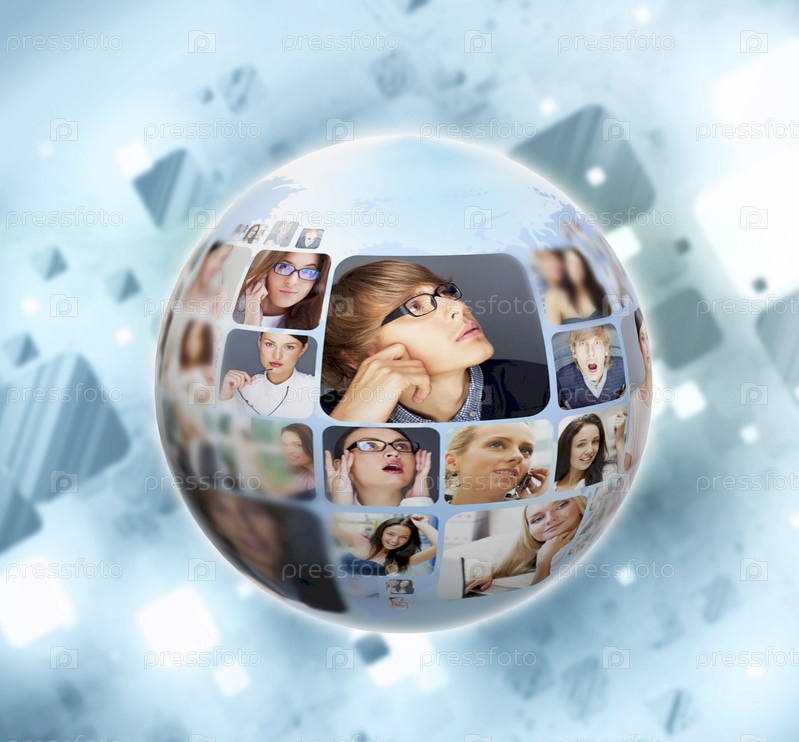 Портреты разных людей на фоне глобуса, концепция социальных сетей и коммуникации