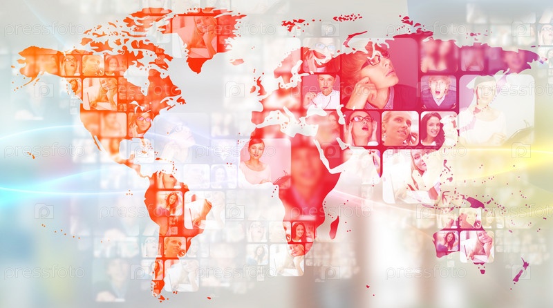 Портреты людей на карте мира, концепция социальных сетей, бизнеса и коммуникации