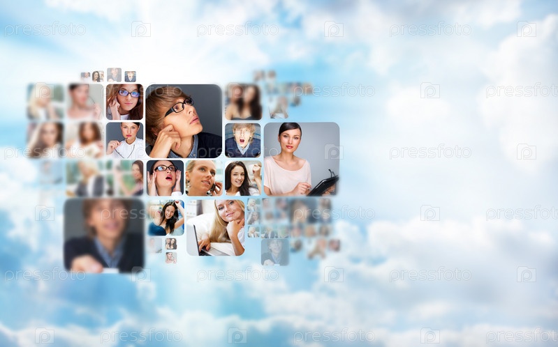 Портреты людей на фоне неба, концепция социальных сетей и интернет-сообщества