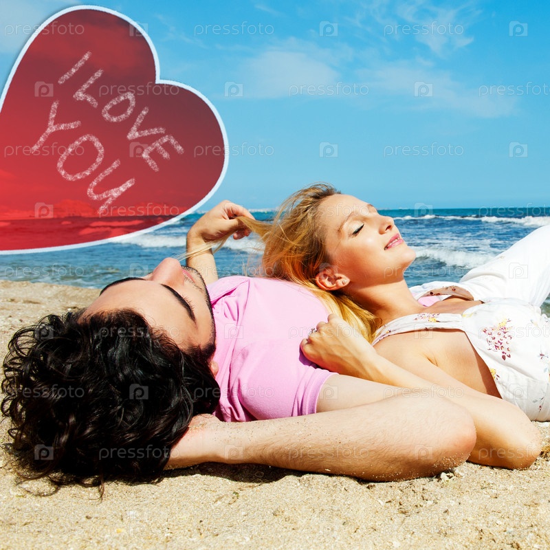 Молодая пара отдыхает на пляже в солнечный день.Сердце с надписью 'Я люблю тебя'