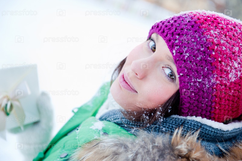 Влюбленная девушка с конвертом в руках зимой на открытом воздухе