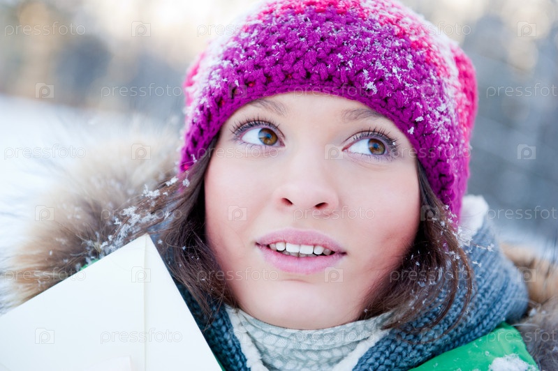 Влюбленная девушка с конвертом в руках зимой на открытом воздухе