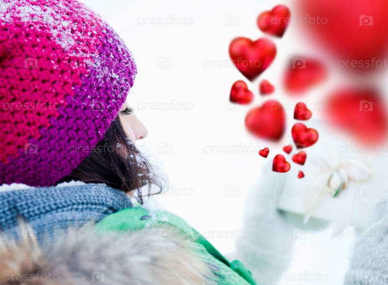 Влюбленная девушка с конвертом в руках зимой на открытом воздухе