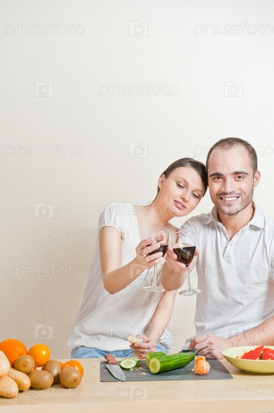 Семейная пара пьет вино на кухне