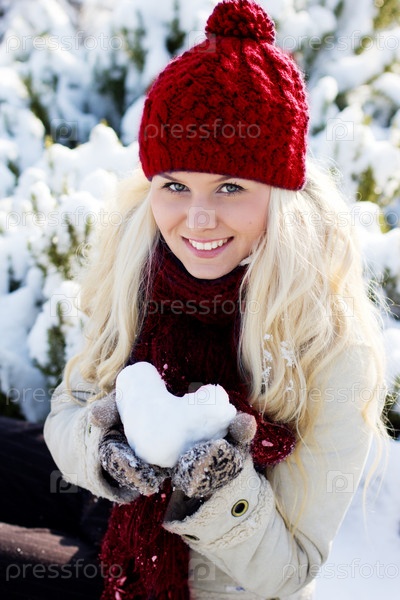 Красивая девушка со снежком в форме сердца