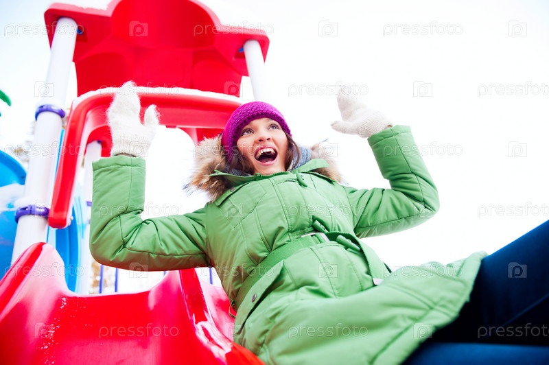 Девушка катается с горки на детской площадке