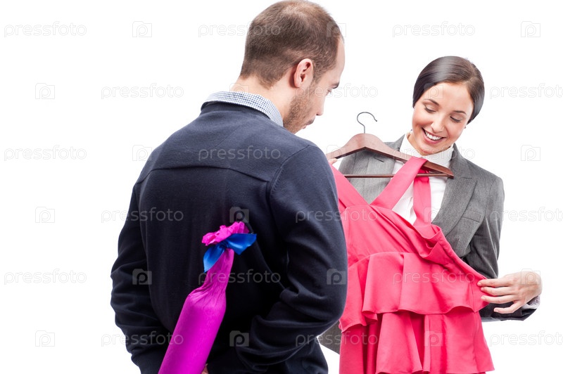 Деловые люди готовятся к корпоративной вечеринке. Мужчина дарит женщине красивое платье и бутылку вина