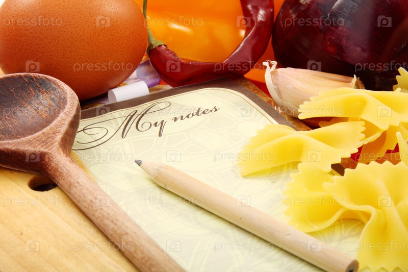 Лист для записи рецепта в окружении различных продуктов
