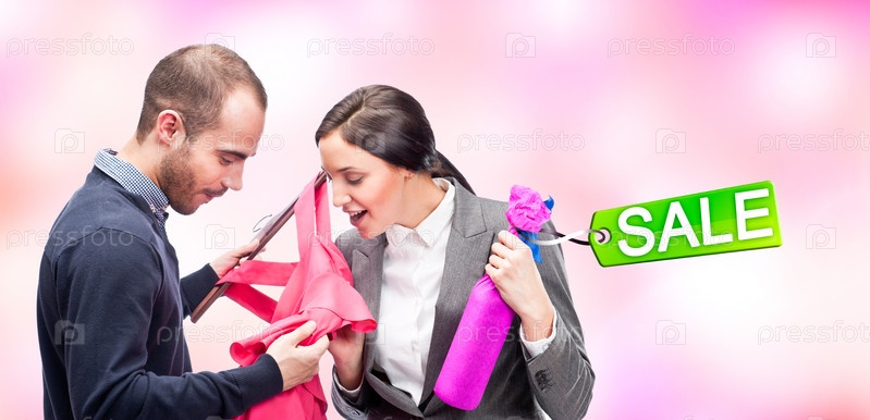 Мужчина дарит женщине красивое платье и бутылку вина с биркой РАСПРОДАЖА на розовом фоне