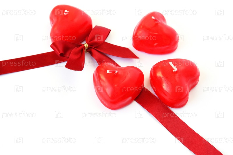 Свечи в форме сердец и красная лента на белом фоне