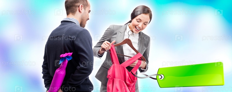 Мужчина дарит женщине бутылку вина и красивое платье с ценником на голубом фоне