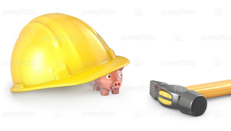 Молоток и свинка-копилка в строительной каске на белом фоне