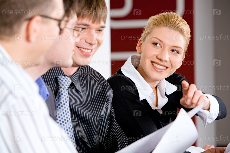 Изображение деловой женщины, указывающей на бумаги во время встречи
