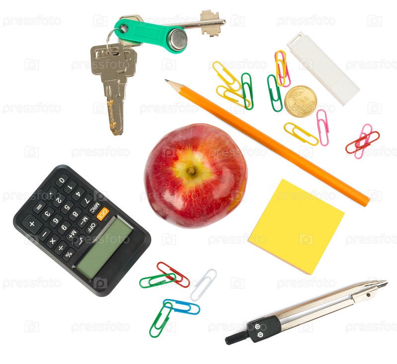 Канцелярские товары с свежими яблоками и ключи