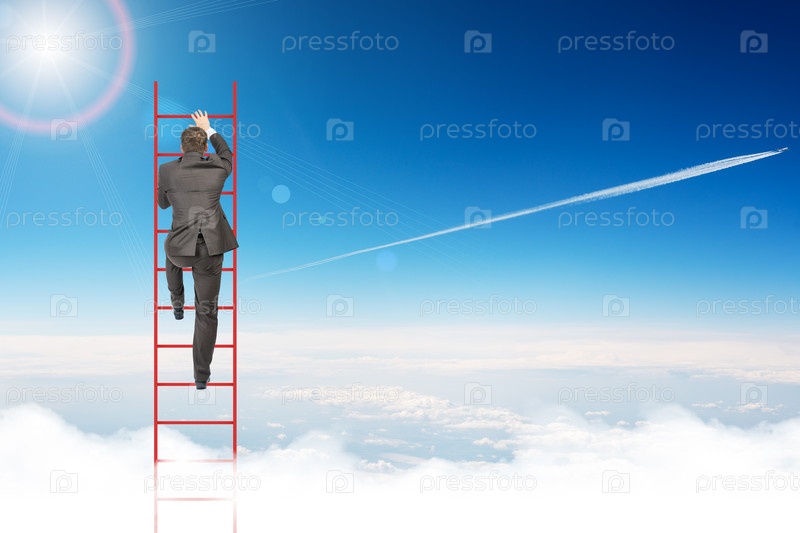 Бизнесмен лестнице на фоне голубого неба, вид сзади