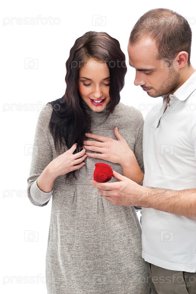 Молодой человек делает предложение своей девушке на белом фоне